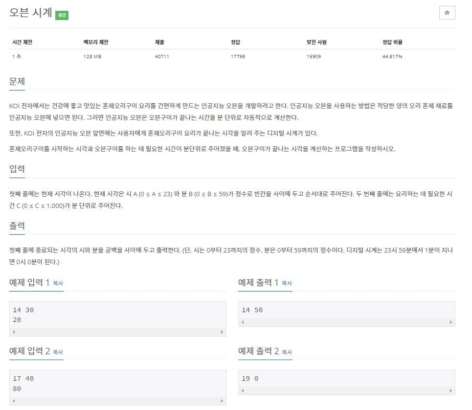 오븐시계 계산인데 시, 분 그리고 거기에 더할 값을 계산하는 간단한 문제이다.