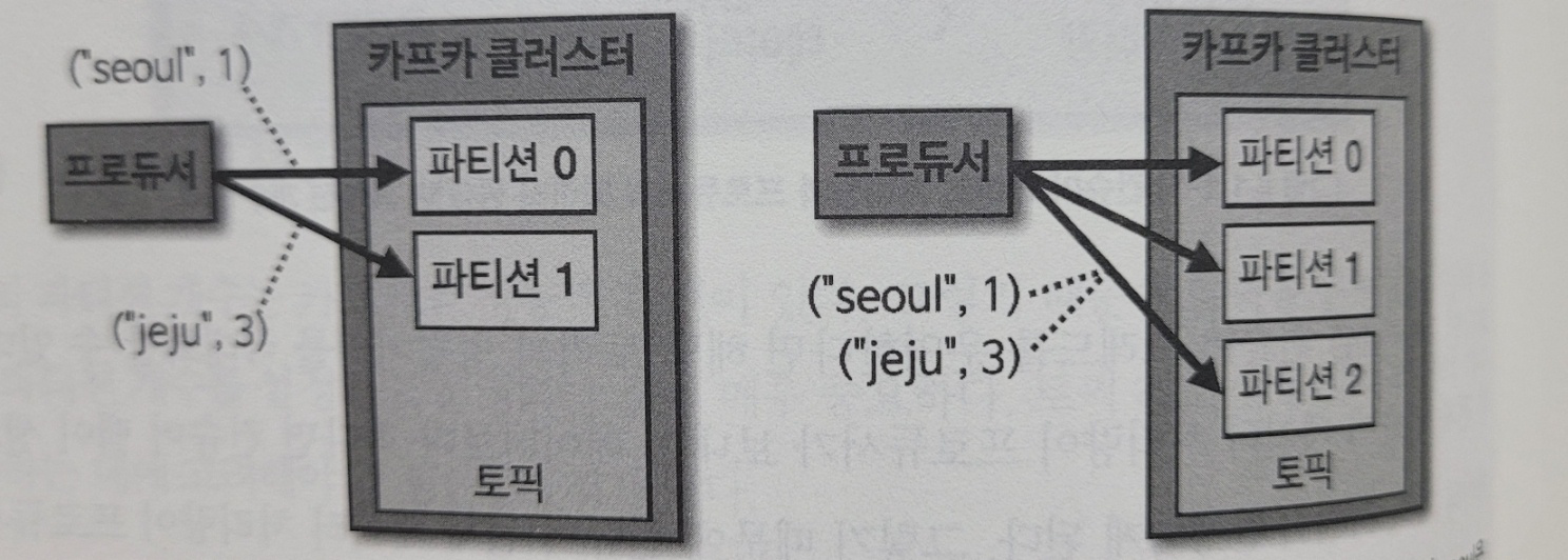 만약 파티션 개수가 달라지면 이미 매칭된 파티션과 메시지 키의 매칭이 깨지고 전혀 다른 파티션에 데이터가 할당된다.