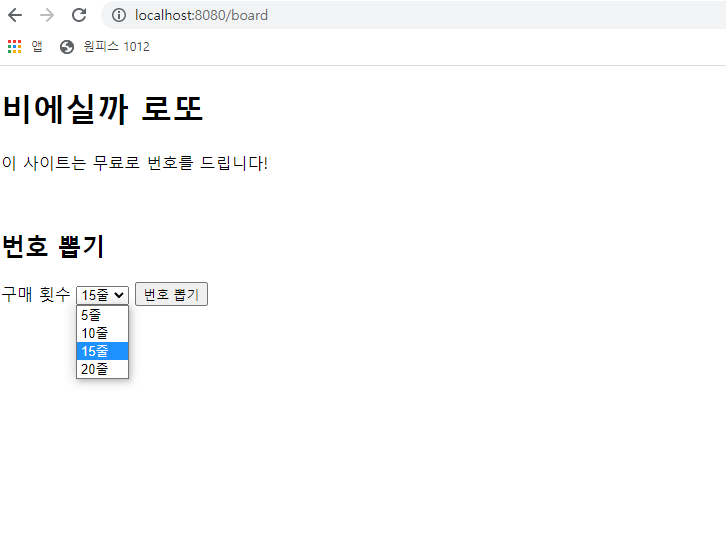그리고 구매 횟수를 정하고 번호 뽑기를 누르면 내 정보가 빠져나갈 것 같은 피싱사이트 느낌이 물씬 나는 메인화면...
