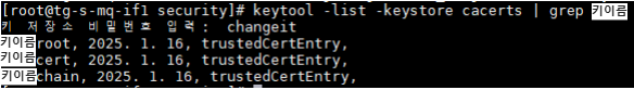 keytool -list -keystore cacerts | grep 키이름