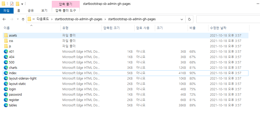 이렇게 다운을 완료하여 확인하면 에러 css, js, 그리고 에러 페이지에 관한 HTML 까지 제공한다.